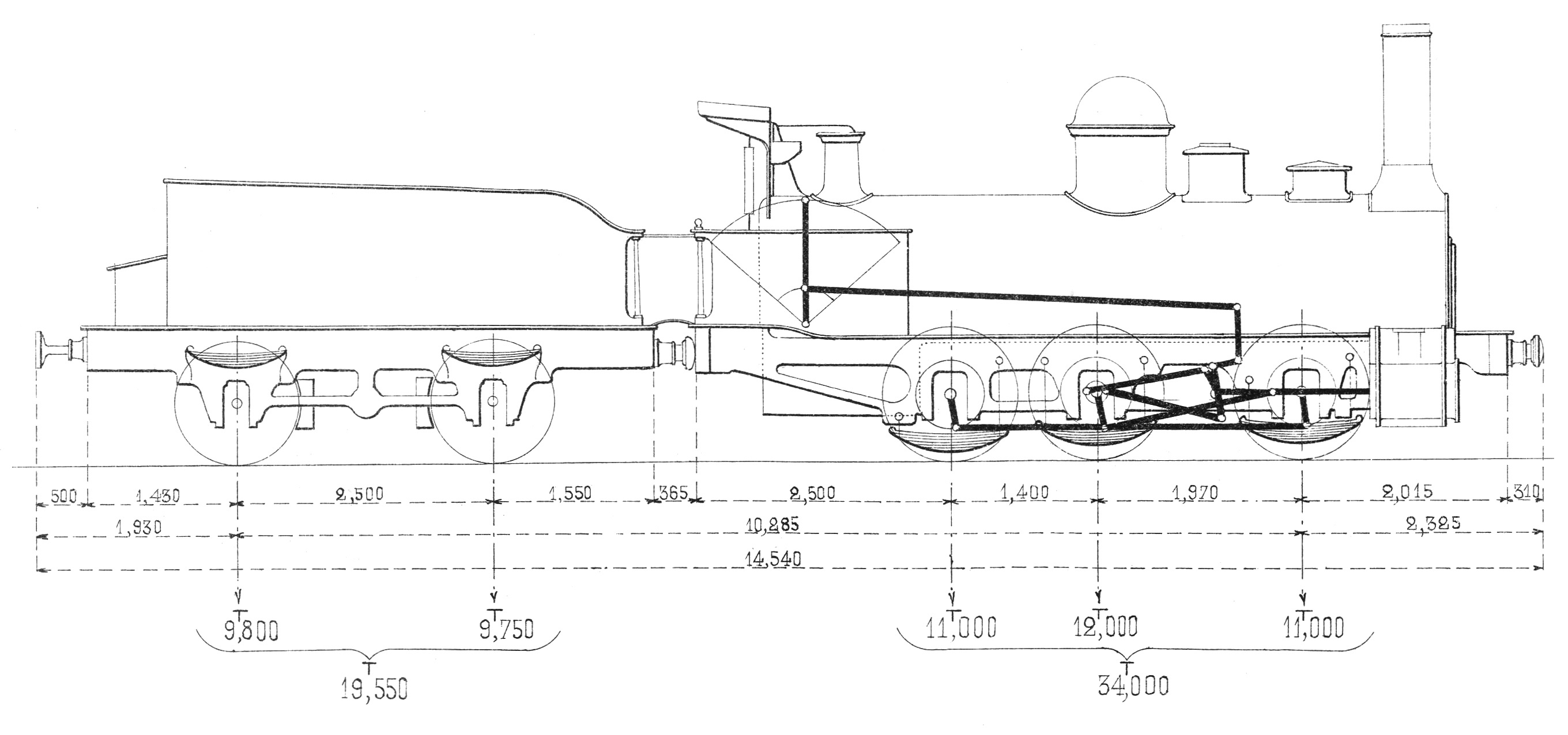 Midi: Locomotives et tenders, Diagrammes et dimensions principales, 1886