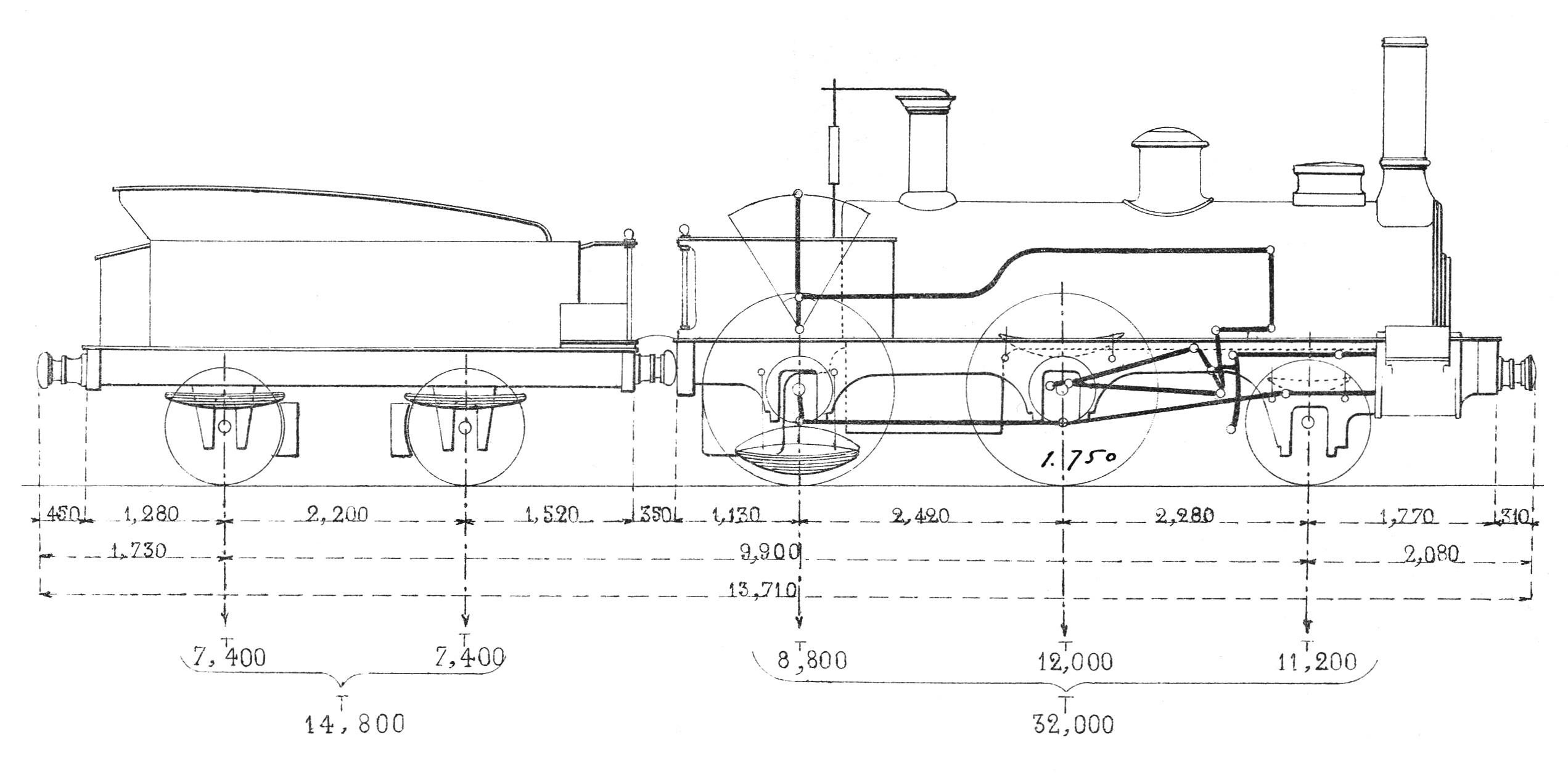 Midi: Locomotives et tenders, Diagrammes et dimensions principales, 1886